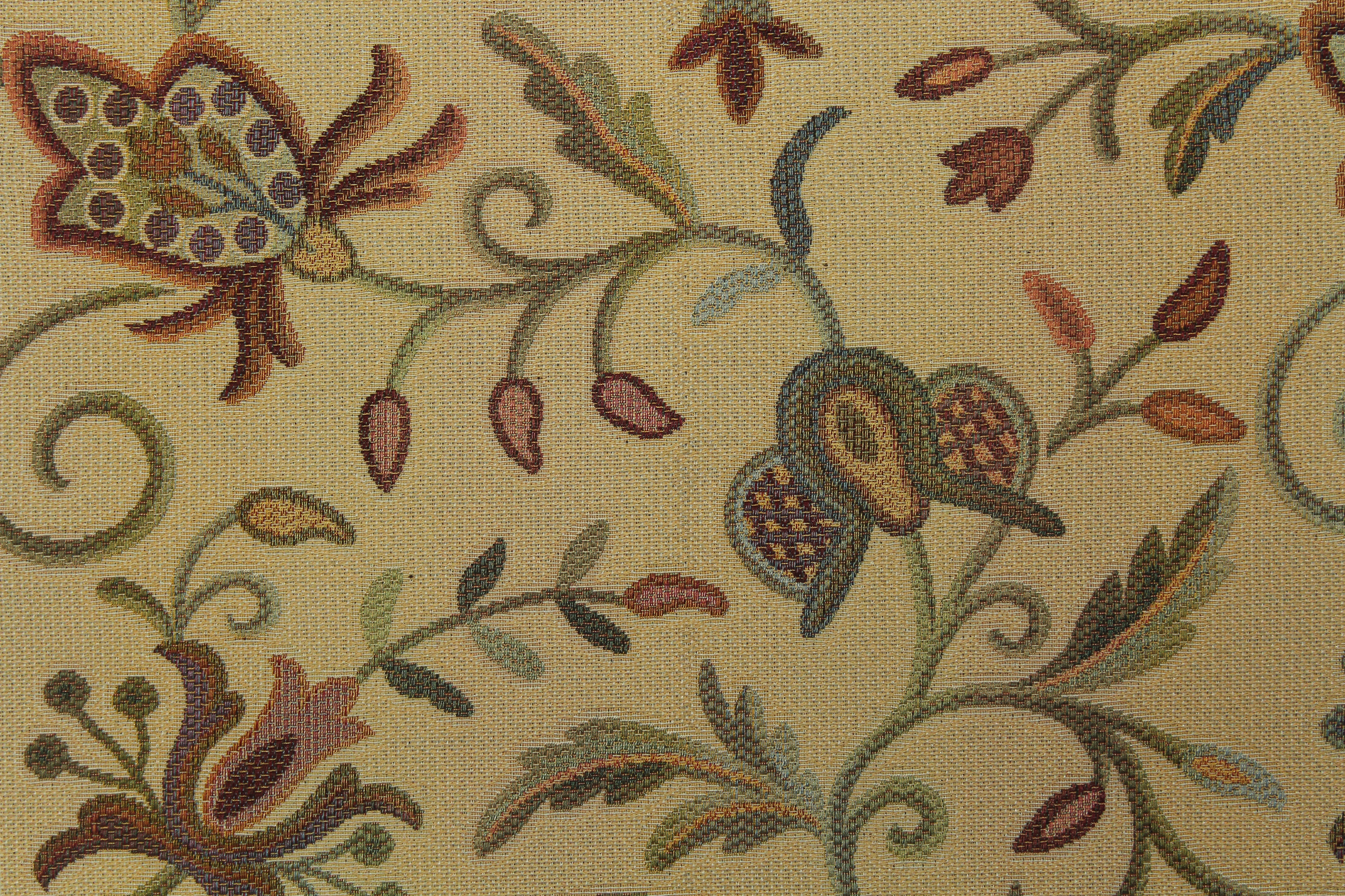 Tecido jacquard com padrão floral, em tons castanhos, verde e azul.