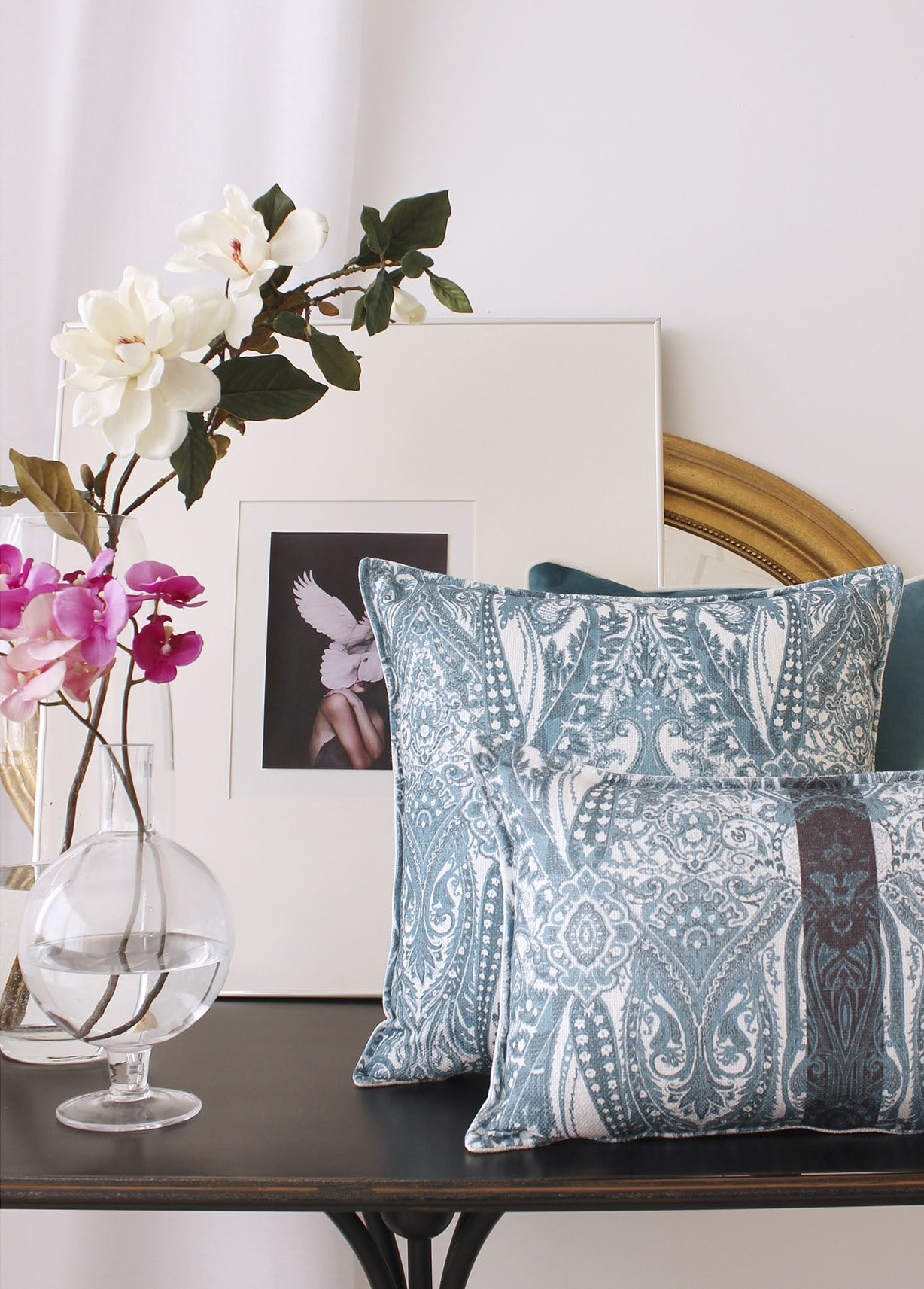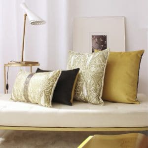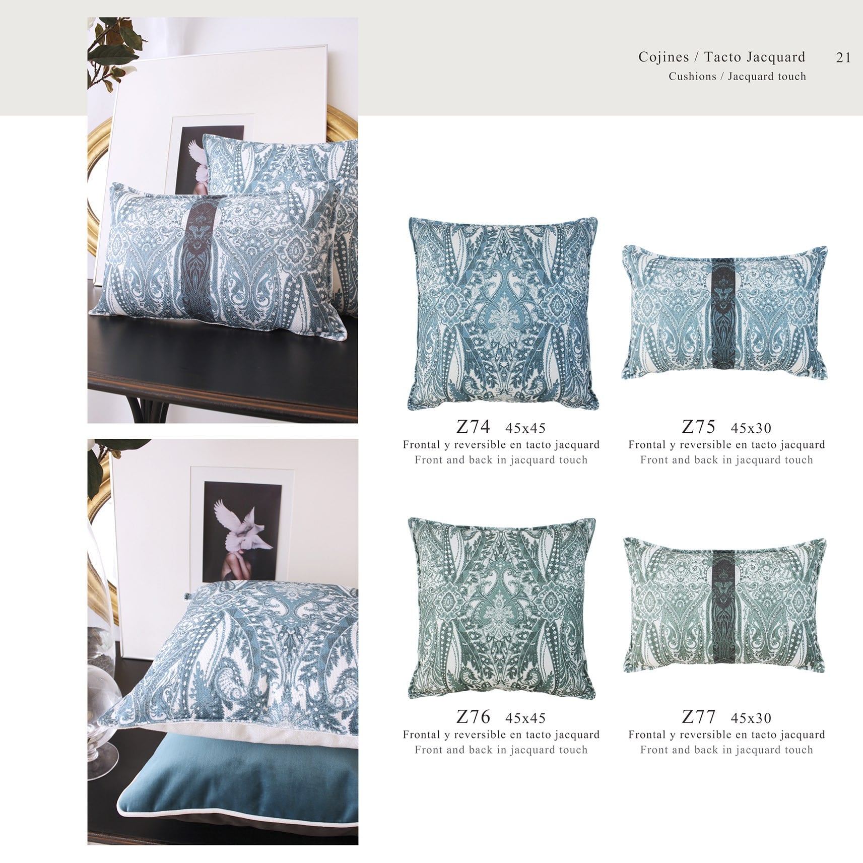 Almofada com uma frente macia e textura reversível com toque jacquard.